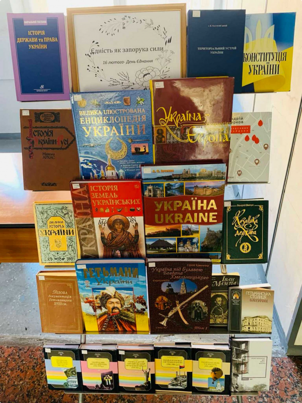 На виставці представлені видання, що розповідають про становлення українських земель, героїчну добу козацької держави, а також про ключові події, які формували нашу національну ідентичність. Особливий акцент зроблено на книгах, які розкривають значення єдності для становлення державності України.