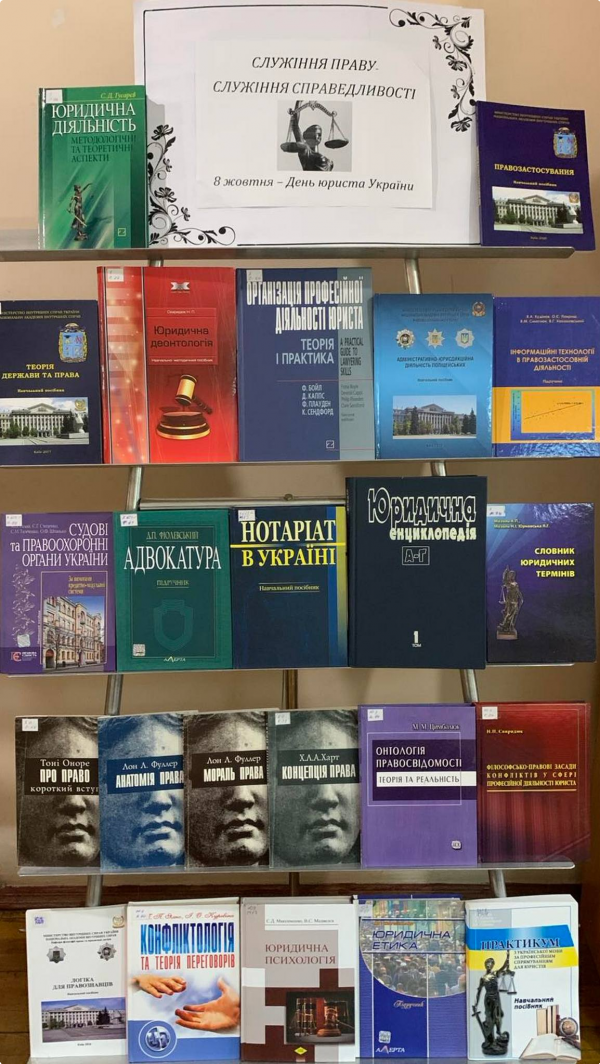У навчально-науковому експертно-криміналістичному інституті бібліотекарі підготували тематичну виставку "Служіння праву. Служіння справедливості". Експозиція включала літературу з організації професійної діяльності юриста, юридичні енциклопедії та інші матеріали, які сприяють формуванню високого рівня професійної компетентності. Виставка підкреслила важливість служіння справедливості як основного принципу роботи юриста.