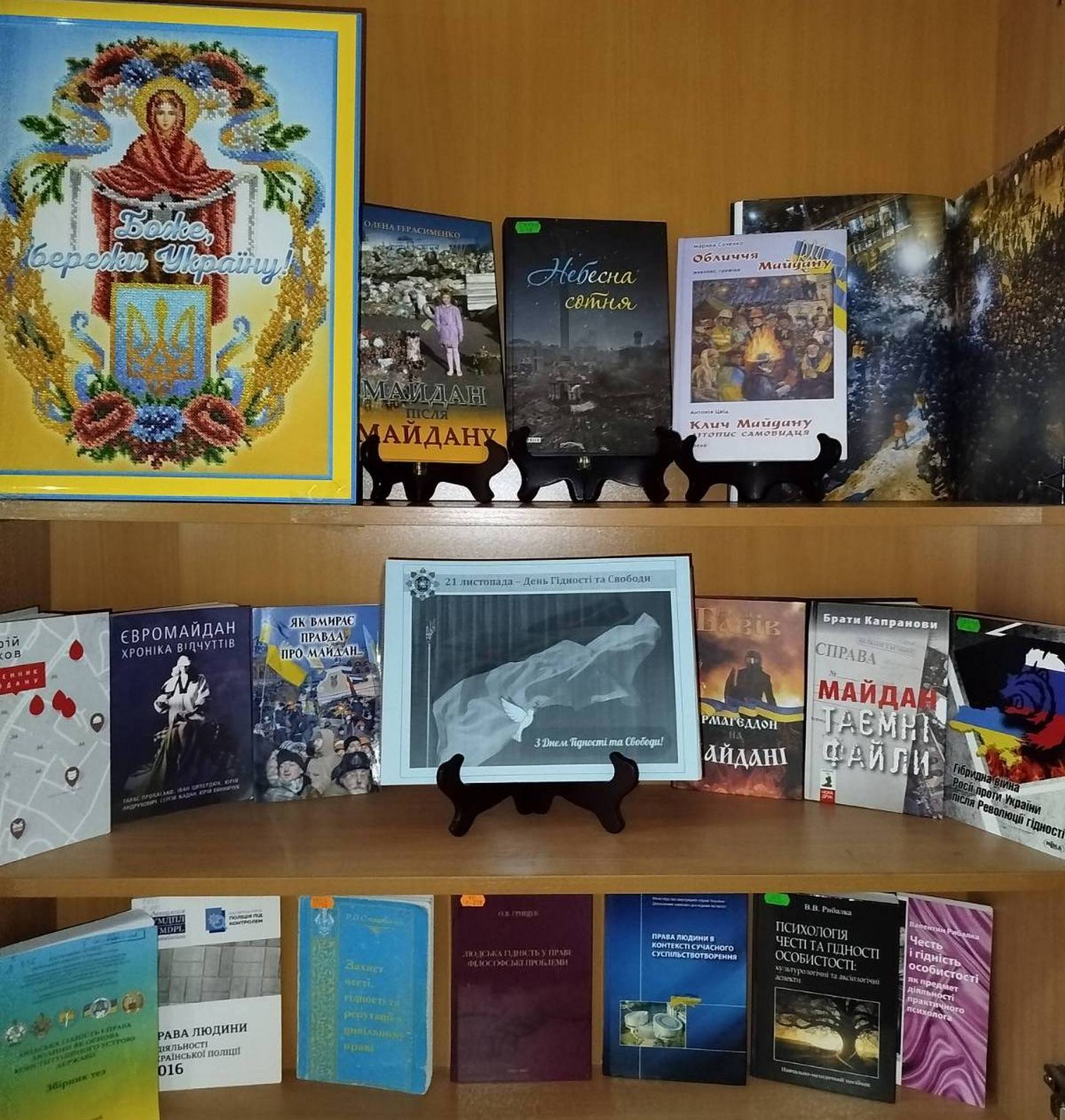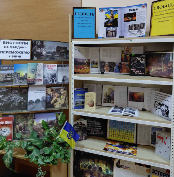 Також уваги заслуговує книжково-ілюстративна виставка «Вистояли на майдані – переможемо у війні», організована загальною бібліотекою в навчально-науковому інституті поліцейської діяльності НАВС. Експозиція спрямована на ознайомлення молодого покоління з подіями, що сформували сучасну Україну, через літературні твори, фотографії та документальні джерела.